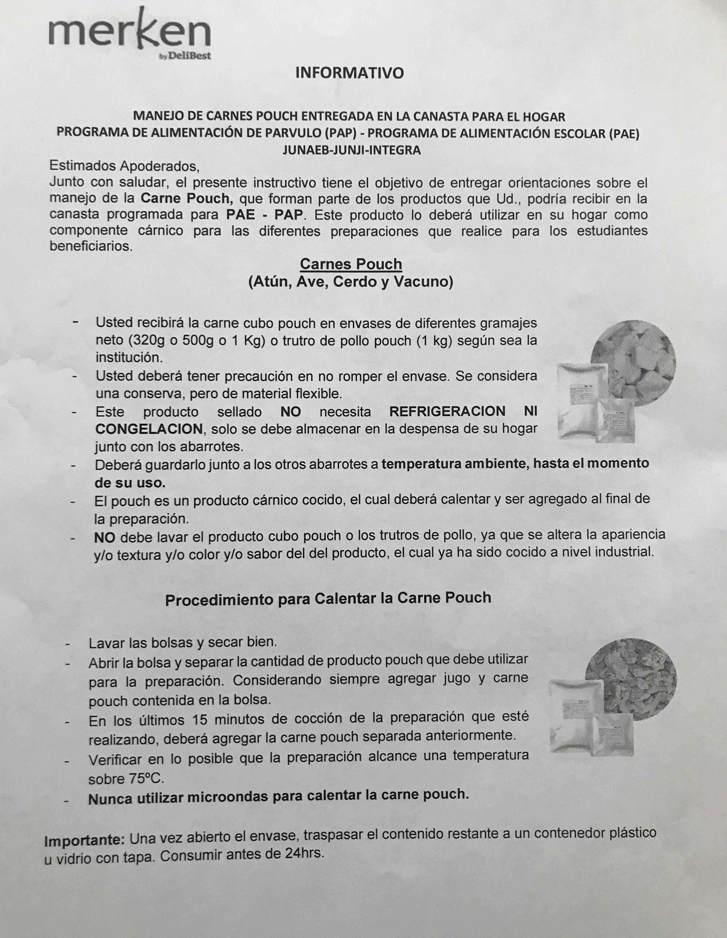 Además, se adjunta un instructivo que entrega orientaciones sobre el manejo de carnes pouch entregada en la canasta para el hogar.