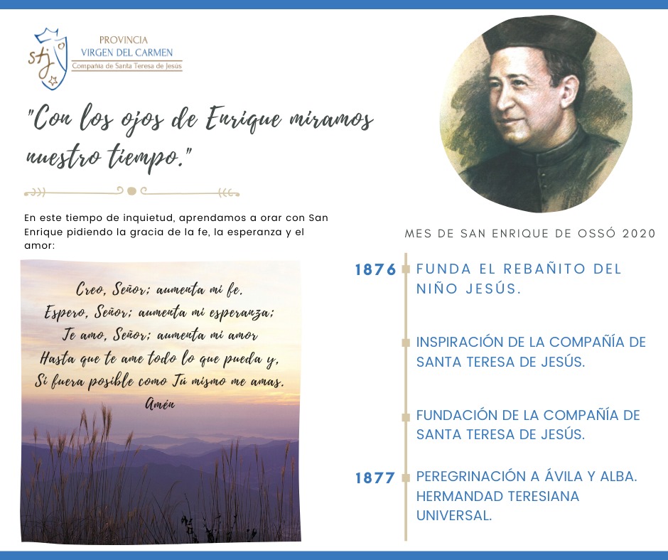Continuamos conmemorando el mes de San Enrique de Ossó. En este enlace podrás revisar los cuartos de hora preparados por la red de colegios teresianos de Chile. También los compartiremos a traves de facebook. ¡Te invitamos a dar un poco de tu tiempo a la oración!